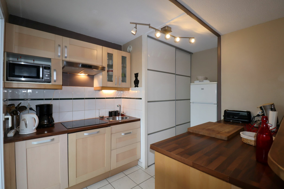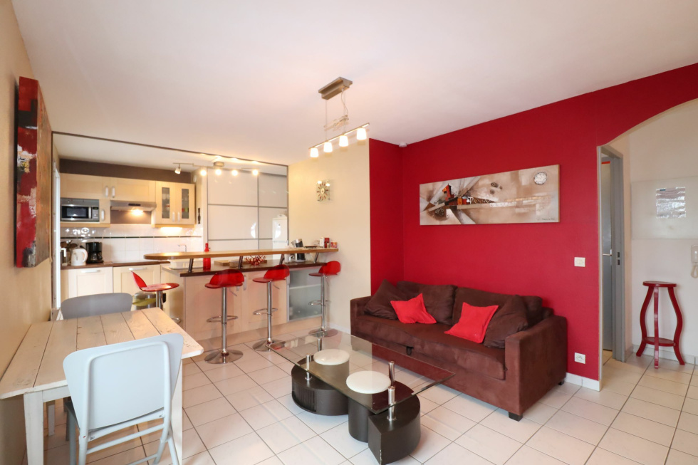 A Urrugne, Quartier Socoa, situé au 1er étage d'une petite résidence, agréable T2 meublé de 45.75m2 qui se compose d'une entrée avec placard, d'un séjour ouvrant sur balcon couvert de 7.36m2, d'une cuisine ouverte entièrement équipée, d'un coin nuit avec WC indépendant, une salle d'eau récemment rénovée et une chambre avec placard.